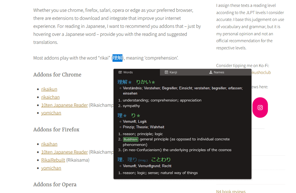 Whether you use chrome, firefox, safari, opera or edge as your preferred browser, there are extensions to download and integrate that improve your internet experience. For reading in Japanese, I want to recommend you addons that – just by hovering over a Japanese word – provide you with the reading and suggested translations.