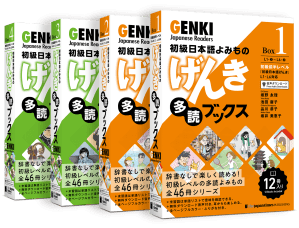 The series consists of 4 boxes that cover all 23 lesson of the two textbooks: Box 1 covers lessons 1-6 of the first Genki textbook, Box 2 covers lessons 7-12 of the first Genki textbook and the boxes 3 and 4 divide the second Genki textbook. Each box consists of 12 short books, except for box 4 which consists of 10.