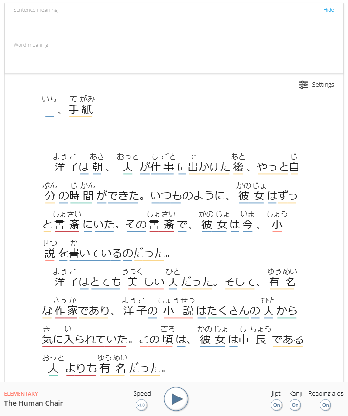On the bottom you have several options to adjust the amount of help you will get in the form of reading aids. You can have the text read for you and can adjust the speed. You can toggle on rōmaji and furigana. And by default, all words are underlined in color to indicate the JLPT level: