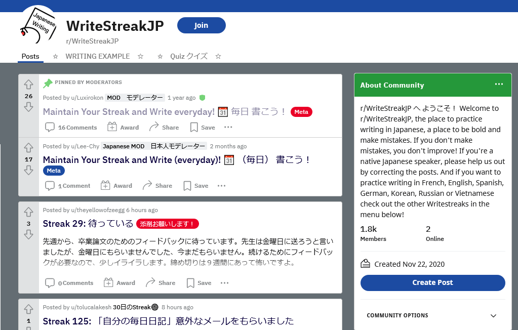 - r/WriteStreakJP – subreddit where learners publish their writing